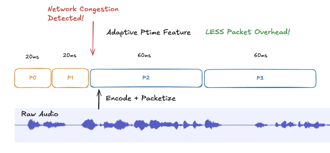 一般来说,随着网络传输改善,ptime 应该缩短(下一部分将深入探讨原因),这就是为什么即使在浏览器中,RTC 配置中也存在自适应 ptime 字段。除了数据包开销,10 毫秒的 ptime 在编码效率上也显著低于 20 毫秒的 ptime。你可以通过这个示例了解浏览器中不同编解码器的实时音频比特率:对等连接:仅音频。