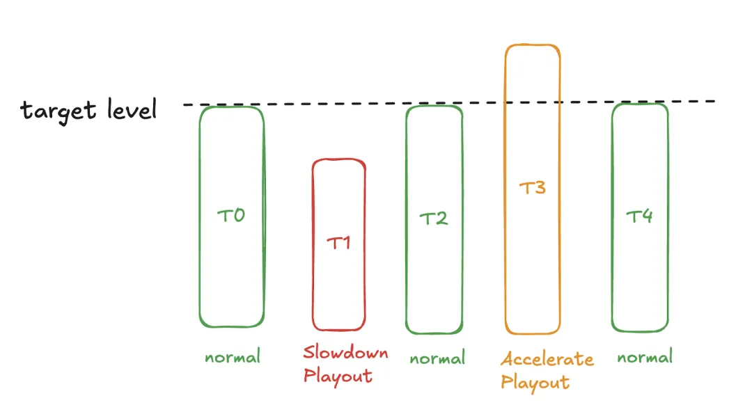 - 当前抖动缓冲延迟大于目标延迟 —— NetEQ 引入的延迟超过了必要水平。换句话说,缓冲区中的数据包比期望的多。在这种情况下,