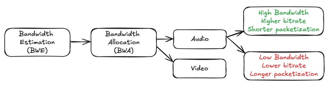 在通话过程中,分包长度可以动态调整。WebRTC 使用一个名为音频网络适配器(ANA)的组件来实现这一点。其理念是在网络状况良好时,发送高质量(通过更高比特率)和低延迟(通过更小分包长度)的音频,反之亦然。