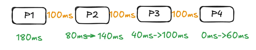 在下面的例子中,P3和 P4遭受累积的网络延迟,但使用到达间隔延迟的目标水平仍为 100 毫秒。记住我们以看到的最大到达间隔延迟作为目标延迟进行说明。