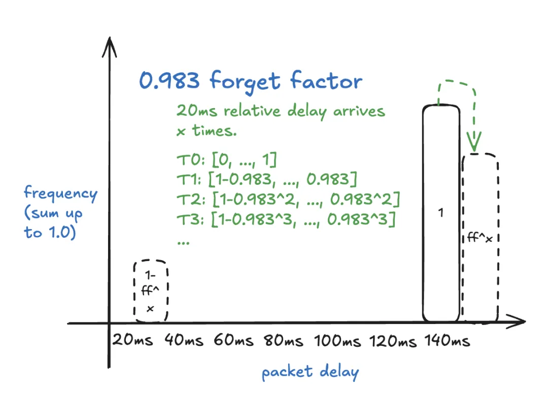 那么,直方图需要多长时间才能忘记 “相对延迟”?在上述示例中,使用 20 毫秒的分包长度,新的 20 毫秒目标延迟取代旧的 140 毫秒目标延迟需要 3.5 秒(175 个数据包)。