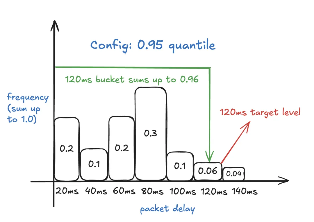 delay_manager取欠载直方图的分位数作为目标水平。例如,如果分位数为 0.95,那么选择 120 毫秒作为目标水平,因为该桶的累积值为 0.96,大于 0.95。分位数是原生应用中的良好调优旋钮,意味着 NetEQ 应该适应的网络延迟百分比。