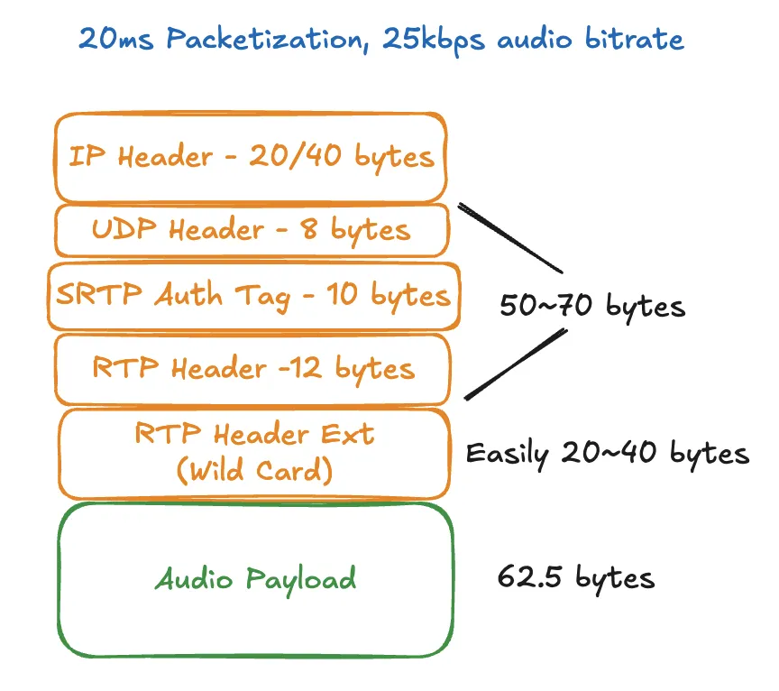 数据包头部(IP/UDP/RTP)开销占用相当大的带宽。考虑到 IPv4 头部大小为 20 字节,UDP 头部大小为 8 字节,RTP 头部大小为 12 字节,SRTP 身份验证标签长度为 10 + 字节,每个数据包携带 50 字节的头部开销。