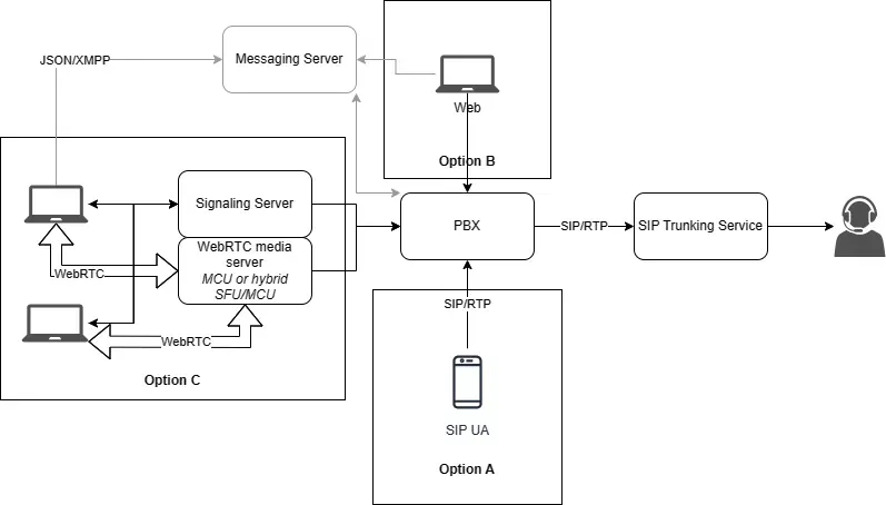 Web 和移动应用程序通过 SIP 协议,经由网关和代理直接连接。媒体直接流入 SIP 服务器,由服务器处理对传统电话的呼叫。