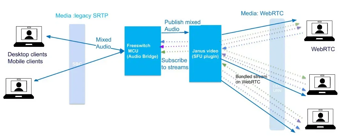 在实现具有 SIP 网关架构方法的媒体服务器时使用的流行开源框架包括:Asterisk、FreeSwitch、LiveKit、MediaSoup、OpenVidu(以前称为 Kurento)、Janus 和 Jitsi。