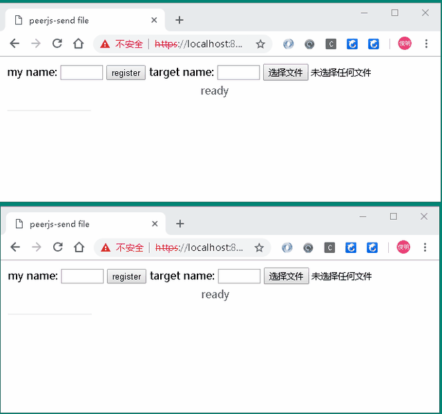 运行效果:在2个浏览器页面上,分别register2个用户,然后在其中1个页面上,输入对方的名字,然后选择一张图片,另1个页面将会收到传过来的图片。