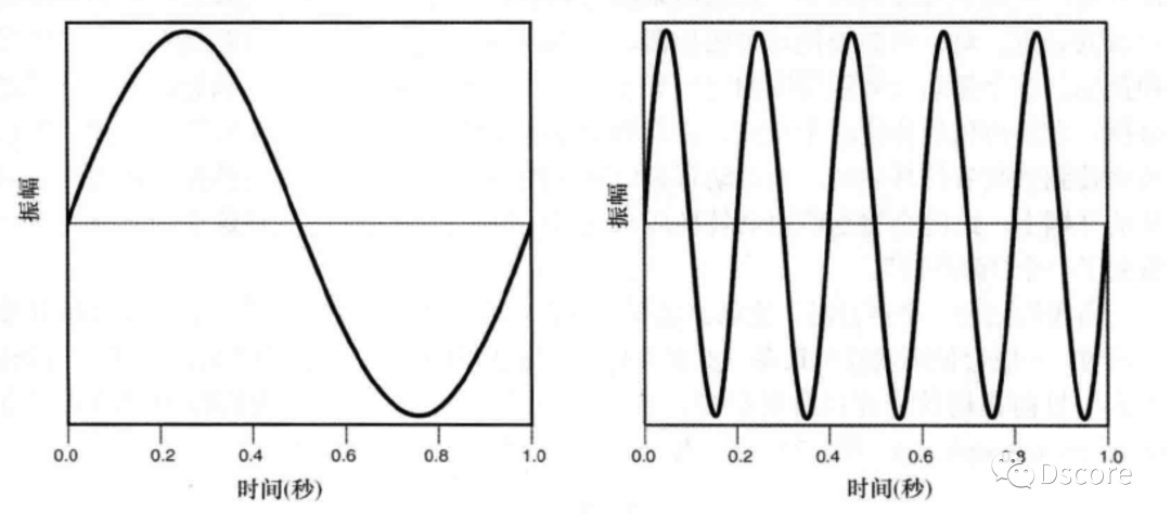 我们对这个信号的两个方面比较感兴趣。第一个是振幅,它代表了电压的强度或相应信号的强度。虽然可以通过不同坐标系来呈现正弦曲线的变化,但是通常我们会选择-1.0f到1.0f作为坐标系的最大值和最小值。对于这个信号,我们感兴趣的另一个方面是频率,信号频率的测量单位是赫兹(Hz),表示在一定周期内振动完成循环的次数。上图左边的图片展示了1Hz情况下音频信号的一个周期,右边的图片展示了5Hz情况下的信号情况。人类可以听到的音频范围是20Hz~20kHz(20 000Hz),所以图上的这两个信号都是不能被听见的,只是其更适合展示而已。