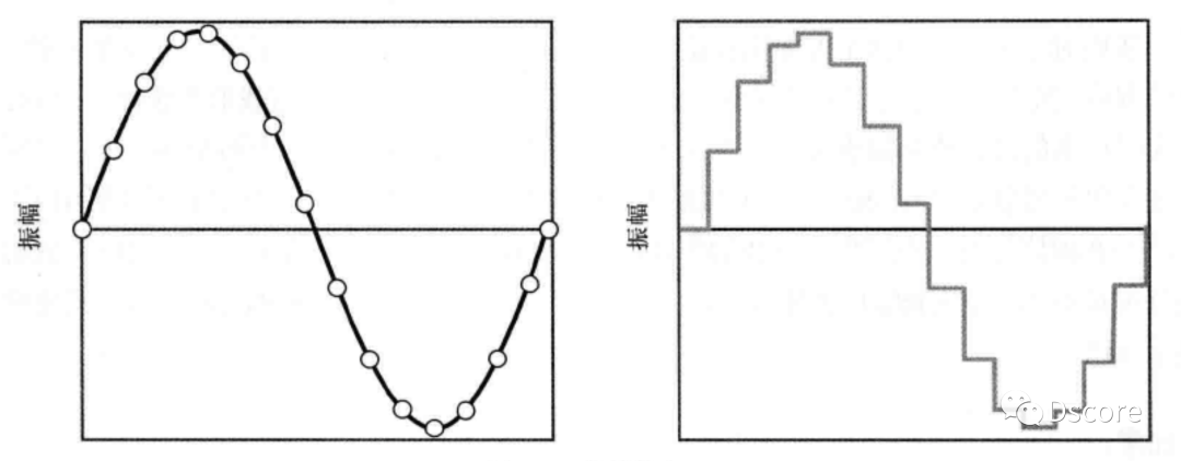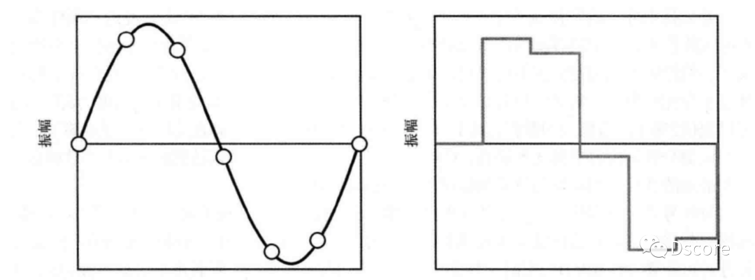 音频数字化的过程包含一个编码方法,称为线性脉冲编码调制(linear pulse-code modulation),比较常见的说法是Linear PCM或LPCM。这个过程采样或测量一个固定的音频信号,过程的周期率被称为采样率。下图展示了在一秒内对信号进行7次采样及信号的数字化结果图
