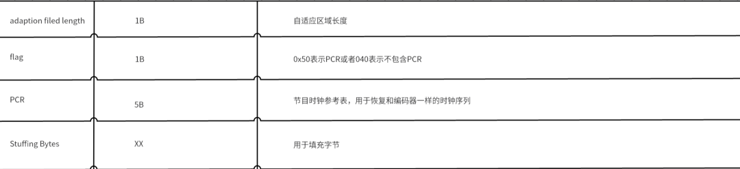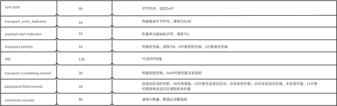 TS层的大小固定在188个字节,并且TS内部也分成三个部分:分别是TS Header、Adaptation Field、Payload。其中TS Header指的是TS的头部,固定四个字节。Adaptation Field没有特别的意义,主要是补充188个字节的。payload指的是pes的具体数据。