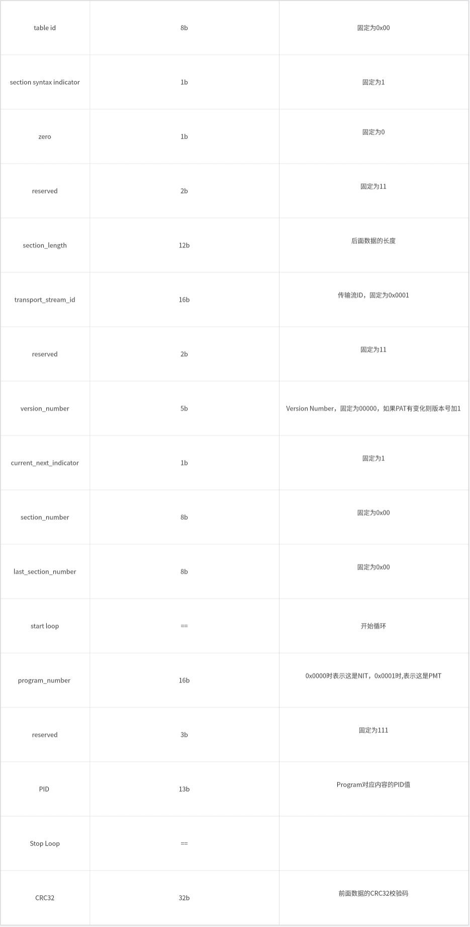 - PAT表:最主要功能是通过此表找到PAT表的PID值,下面这个是PAT表的内容