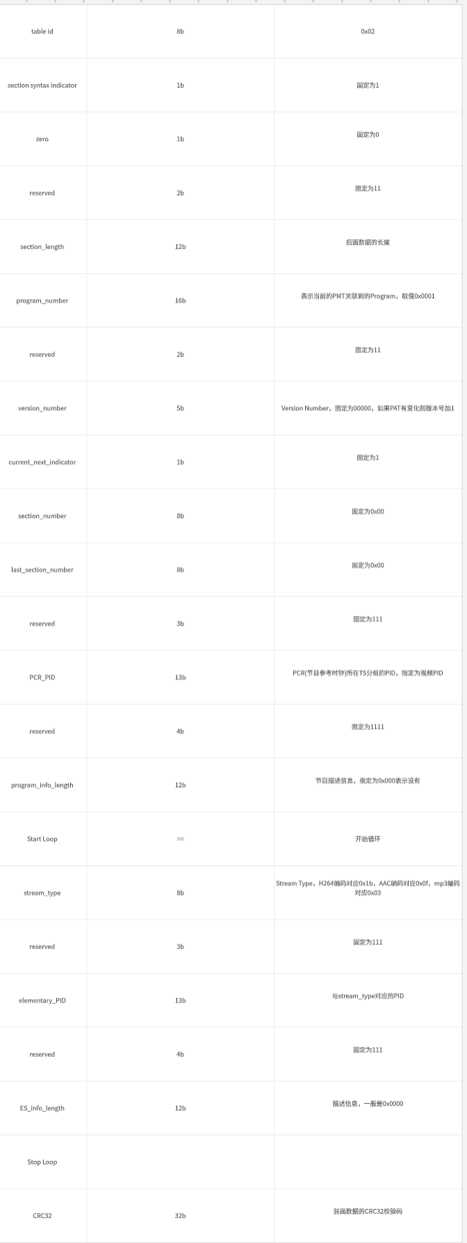 - PMT表:最主要功能是找到音视频的PID值,下面是PMT表的具体内容