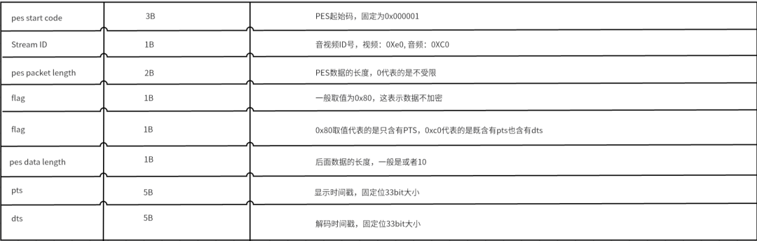 我们介绍完Transport Stream层之后,我们再来看看PES层的内容。PES层的主要功能是在每一个音视频流上添加时间戳。这就是我们经常在ffplay或者vlc播放器看到有PTS、DTS的信息。我们先来看看PES的结构: