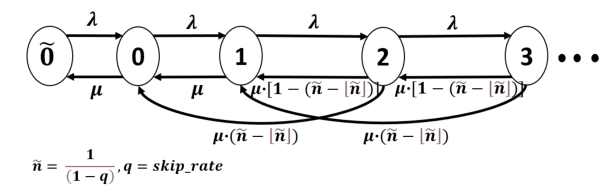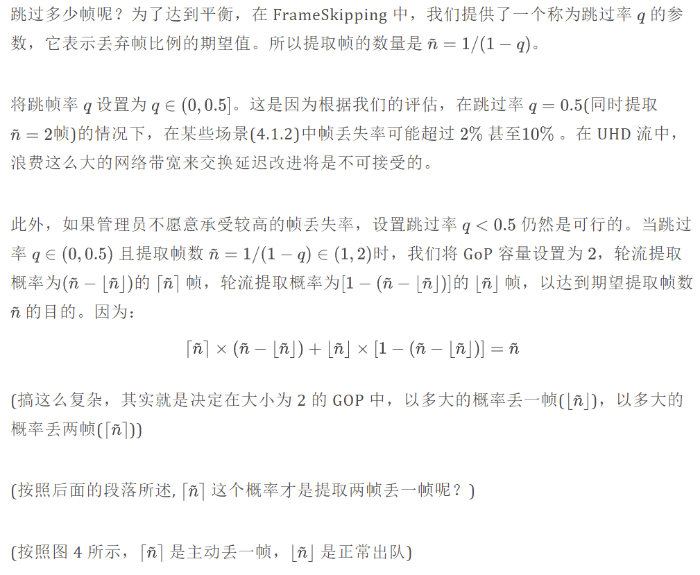 为了量化 Frame-Skipping 不同跳转率 q 的延迟改进和帧损耗性能,我们引入了一个数学模型,并用数值例证如下。
