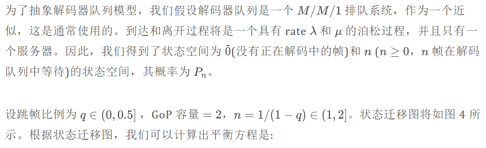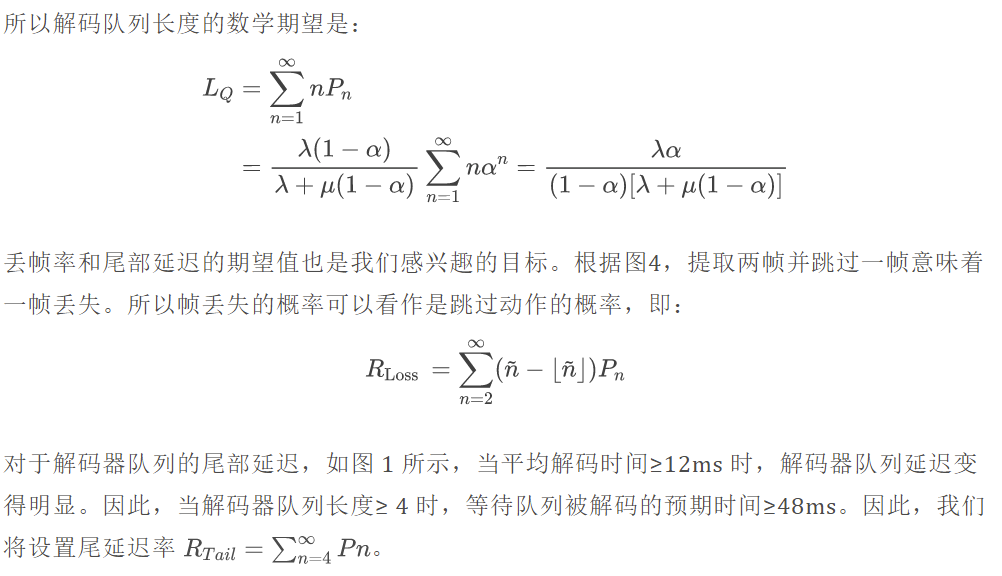 为了量化性能并提供一些推荐的跳帧率 q,我们将提供一个数值说明。我们设定60个帧率的到达率,即 lambda = 60,并设定解码器时间 = 12ms 的服务率(在图1中有明显的解码器队列延迟) ,即服务率 μ = (0/0.012) ≈ 80。