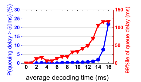 我们研究了基于 60 亿帧规模的网络轨迹,评估解码器队列延迟的严重性。我们首先注意到解码器队列延迟问题会随着平均解码时间的延长而变得更加严重。根据图 1,我们注意到对于那些平均解码时间 ≥12ms 的流到客户端的帧,解码队列延迟 > 50ms 的帧的比率将超过 1% 。也就是说,在 60fps 的视频流中,平均每两秒(2s 120帧,百分之一概率就是1帧延迟 > 50ms)发生一次。与 RTT 和解码时间的十几毫秒延迟相比,这种严重的解码器队列延迟(> 50ms)是显着的,并且可能容易导致一个显著的总延迟降低用户的体验。因此,有必要消除严重的解码器队列延迟。