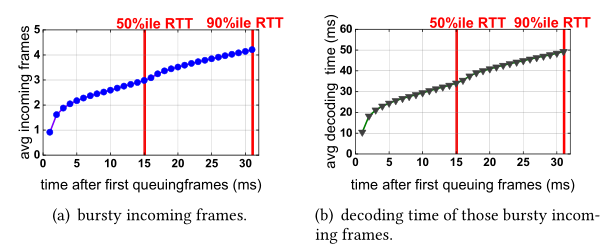 此外,等待那些突发传入帧排队的时间是显而易见的。根据图2(b) ,这三个 15ms RTT 以下的突发传入帧平均需要花费 34ms 去排队(解码)。因此,随后传入的帧可能会遭受几十毫秒的排队延迟。在 RTT 为 32ms (图2(b)中的右行) 的第90百分位数下,这个问题甚至会更糟。