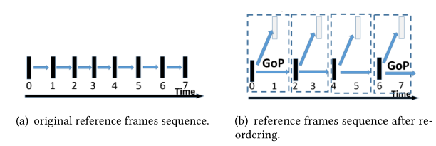 在对编码器参考帧序列重新排序后,为了保证丢弃后的解码质量,有些帧不能用来预测后续帧。因此,当我们提取解码器队列中相邻帧的图片组(GoP)容量时,必须有一个基层帧(图3(b)中的黑帧0、2等)。由于基本层帧是唯一用于预测下列 GoP 帧的帧,因此仅对基本层帧进行解码并在 GoP 中丢弃其他帧不会损害解码质量。