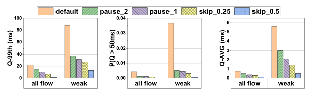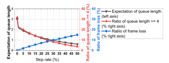 我们评估了跳帧率 q,q ∈ [0,0.5] 下的延迟改进和帧丢失性能。根据图 5,随着跳帧率 的增加,队列长度的期望值和尾部延迟比例(队列长度≥4)减小。然而,当跳帧率增加时,帧丢失状态变得更糟。因此,在延迟改进和帧损失之间存在权衡。