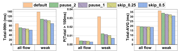 对于在这种权衡下选择的跳帧率,我们实验 和 。当 时,队列长度期望值降低到 1,尾延迟比降低到 ,帧丢失率不超过 。当 时,我们可以获得显著的延迟改进,这对于像云游戏这样对延迟敏感的 RTC 服务是很有吸引力的。跳帧率的进一步研究将以用户的体验作为我们今后的工作。