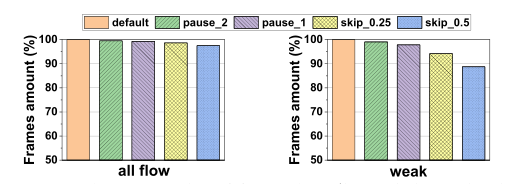 对于帧丢失的情况,根据图 8,我们可以注意到,更好的延迟改进性能也意味着更多的帧丢失。因为更好的延迟改进是通过暂停/跳过更多帧来实现的。