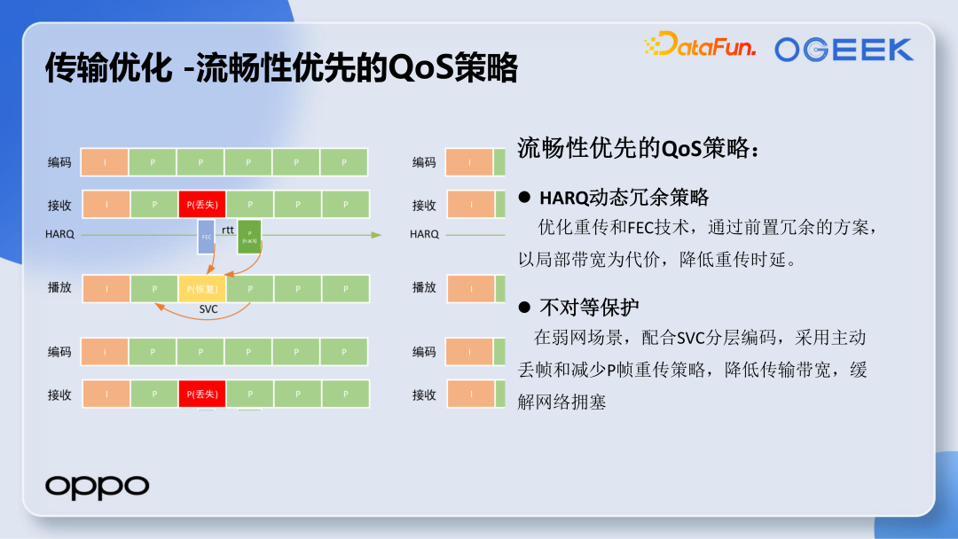 依据不同信源做不同保护策略,在弱网场景,配合 SVC 分层编码,采用主动丢帧和减少 P 帧重传策略,降低传输带宽,缓解网络拥塞。