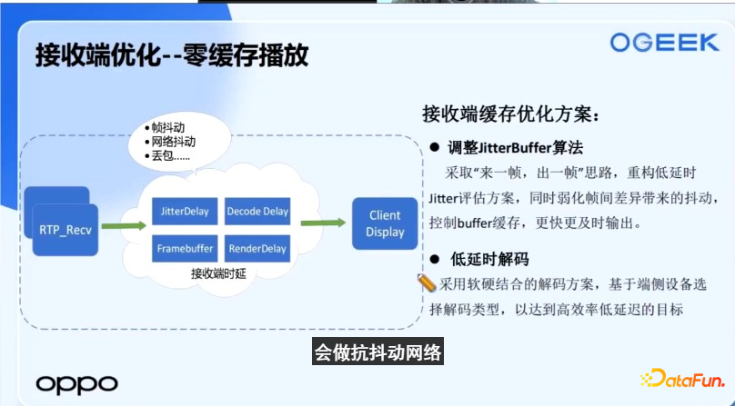 下面介绍接收端的优化。在音视频发送到客户端播放之前经历三个阶段:抗抖动、解码时延、渲染时延;最后到接收端时延。