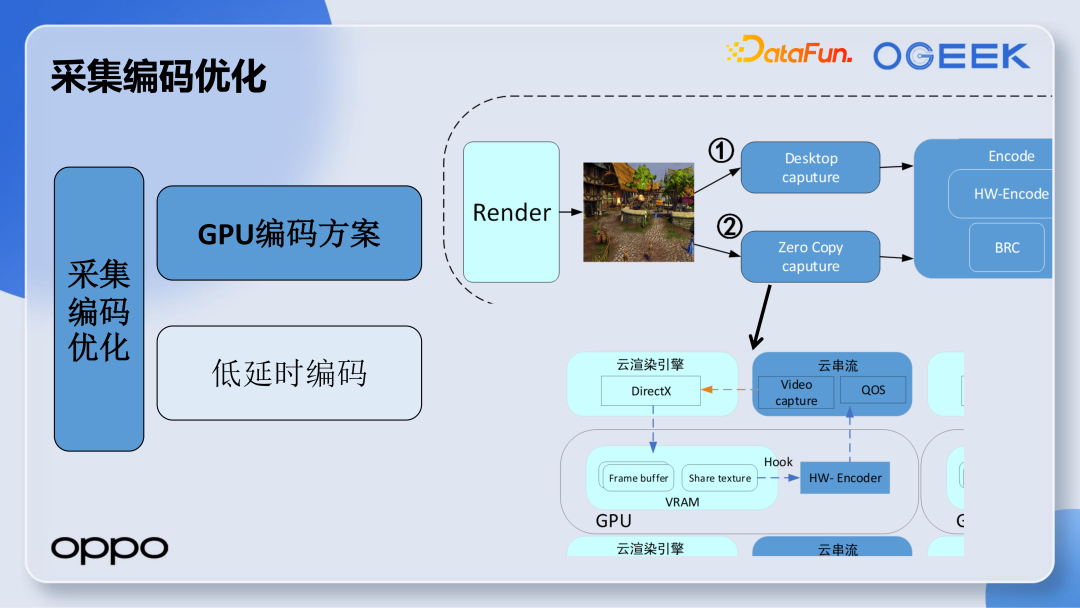 (1)GPU 编码方案:GPU 编码方案的调整包括渲染画面显示后,通过屏幕或窗口采集,送到编码模块进行编码;另外,引入 GPU 的优势,通过在 GPU 进行渲染和编码,引入零拷贝编码方案。