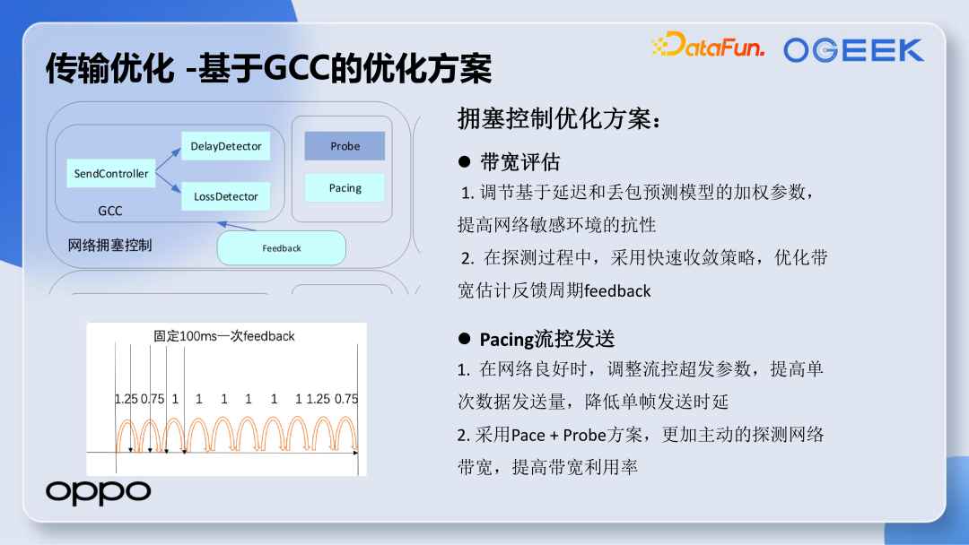 (1)拥塞控制优化方案:OPPO 的 RTC 基于 WebRTC 演进,控制算法是基于 GCC 的优化方案,在低时延的预算情况下,媒体传输在发生网络拥塞时降低一些码率,避免发生更严重的网络拥塞,减少丢包重传及时延上升。