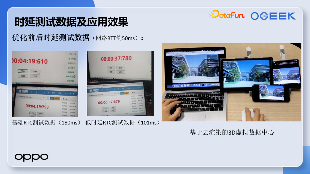 右边图片是 OPPO 的 3D 虚拟数据中心,基于优化后的 RTC 技术,整体时延及体验得到了提升。