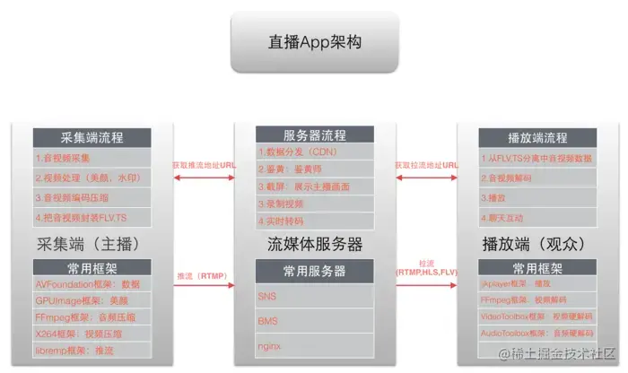 - 采集 → 滤镜处理 → 编码 → 推流 → CDN分发 → 拉流 → 解码 → 播放互动
