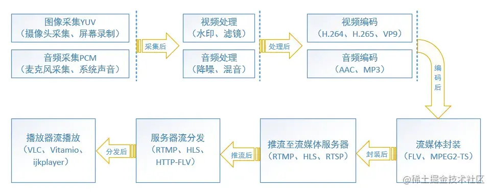 - 总流程:采集 → 前处理 → 编码 → 传输 → 解码 → 渲染