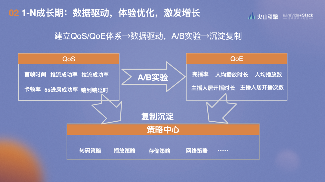 在业务快速上线后,体验的优化会成为这一阶段的重要目标。此时,需要具备QoS/QoE体系,在我们的整个云+端体系中,对应有完整的数据体系,让业务开发者省去了数据上报、采集、治理的流程。可以直接借助全面的QOS指标来进行A/B实验,比如在点播场景的优化中,上传协议分为A/B采样组,A组使用QUIC,B组使用TCP,端侧实时观测首帧时间以及播放时长的指标情况,最终根据A/B实验结果进行快速策略调整。
