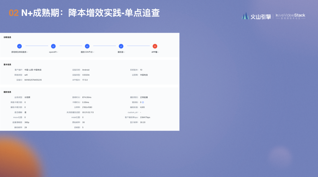 业务发展到成熟阶段,降本增效就会成为主题,我们自己和很多外部客户在这一阶段会经常抱怨,当终端侧用户不断反馈卡顿、黑屏的问题时,我们很难在云端协助排查,最多提供客户端IP和运营商地址信息,很难准确定位到出现问题的播放阶段。
