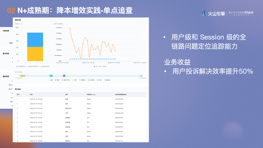 第二个是单点追查,基于单用户和Session级别的问题定位,追踪到问题环节,每个环节都能够展示较详细的错误信息。进一步细分播放详情,如首屏时长细分为加载数据、预处理、播放器准备耗时、整个播放环节的播发码率和终端的下载速度情况。终端播放时的每次事件记录,以及事件发生的持续时间也都有记录。