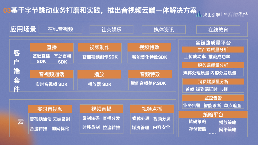 客户端打包丰富的SDK套件,包括RTC音视频的采集、播放器、视频制作、特效、直播的SDK等。全链路配备质量平台监控,保障QoS和QoE,底层通过策略平台来进行相对应场景的策略调整。
