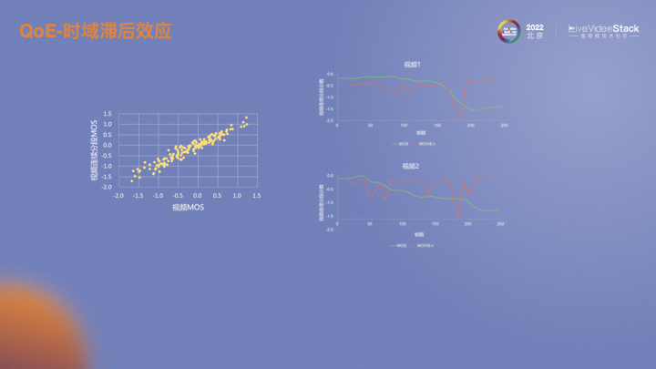 假设现在有一个十秒的视频,每一秒都有一个MOS。每一秒MOS的均值和整个视频的MOS有强相关性,基本可以认为互等。在这样的前提下,滞后效应可以描述为当视频的画质下降时,MOS也会立即下降。但当画质恢复时,由于人的主观对之前的损失有记忆,提升是一个缓慢的过程。视频2反映的趋势也是如此。画质不断波动,画质差的印象会一直在人的印象中,主观MOS很难提升。