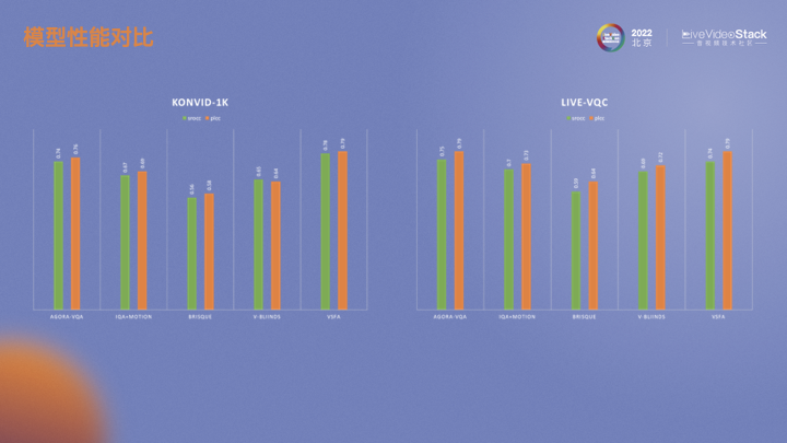 我们也同时在两个数据集上做了实验。AGORA-VQA是目前采用的方法。IQA+MOTION是基于深度学习的IQA算法。BRISQUE是传统IQA算法。V-BINDS是传统视频的算法。VSFA是视频的深度学习算法。