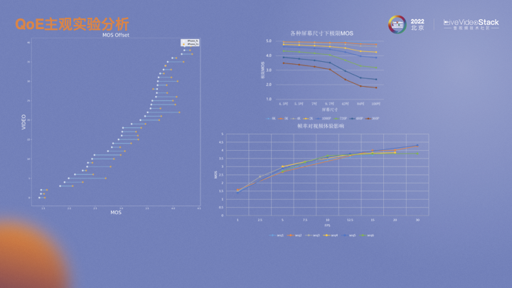 左图是几十个视频在iPhone上全屏和半屏观看时画质MOS分变化趋势图。可以看到,相对于hs,fs大部分情况下画质都有所降低。建模的目的就是为了找出相同画质范围内的偏移。右上角的图来自华为的白皮书,表示不同分辨率视频在不同尺寸设备上的极限MOS。越小分辨率的视频在更大尺寸的设备上播放衰减越严重。右下角是我们做的一个实验。对六个原视频进行不同帧率的MOS评估,发现不同视频,随着帧率的上升,MOS会有所提升。但不同视频内容导致的变化趋势也略有不同,与视频画面会有很大关系,当运动剧烈时则需要更高的帧率支持,反之则不需要浪费更多的帧率资源。