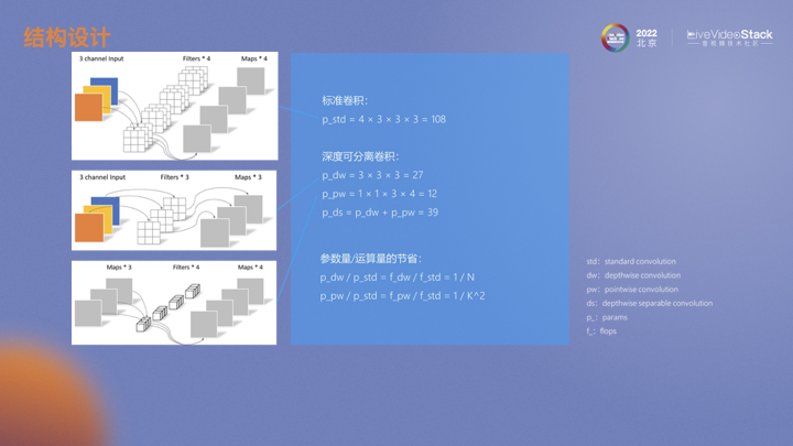 基于深度学习算法落地时避免不了的一个问题就是运算量与性能的平衡。怎么在减小模型参数和运算量的同时保持甚至提高性能,业内一些小模型的设计给我们提供了一些思路。第一张图是一个标准卷积过程,输入3通道图片经过一个4通道卷积层。MobileNet中对标准卷积进行了拆解,拆解成一个个深度卷积和逐点卷积。深度卷积的参数量和运算量有相同的关系,均为输出通道1/N,而逐点卷积为卷积核大小平方分之一,通常在较深的网络中N远大于K,所以也可以看出这种结构下运算量主要来自于逐点卷积。
