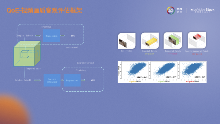 首先考虑的是视频解码端画质的建模。业内目前主要有两种方式。一种是端到端的训练方式,另一种是非端到端的训练方式。端到端是对一组视频直接采样,然后回归MOS。采集的数据在分辨率和帧率大概率是不一样的,需要通过采样统一size。非端到端利用特征提取器,将原始视频通过特征提取器提取到同一个维度,然后再回归。右边的图是不同的采样方式。第一个是空域采样,保证了所有时域上的帧数。还有时域采样和时空域采样。下面的图表示不同采样方式MOS和原始视频MOS的相关性。在空域进行时域采样时相关性最高,时域信息没有空域信息重要。线上推理完整的size则需要消耗更多资源。评估视频的画质不仅仅是空域上的失真,如果仅有空域的失真,直接用IQA拟合VQA即可,但目前该类方案的拟合效果都不佳。所以时域的影响不能消除。