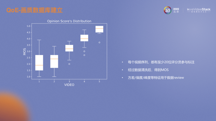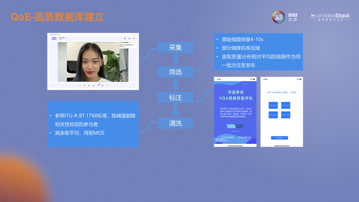首先建立了一个画质主观评估数据库,通过内部视频软件收集了一些数据。随后对收集数据进行处理,通过我们开发的打分软件,按照ITU标准进行主观评估,得到每个视频的MOS。