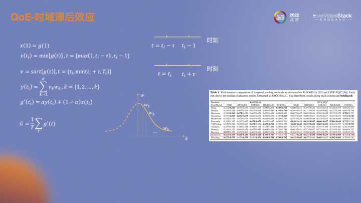 通过建模可以非常直观的反映该效应。充分考虑前ti时刻和后ti时刻的影响。前ti时刻类比快速下降,对前ti时刻每一时刻的预测值取最小值,可以体现MOS快速下降的行为;而对后ti时刻的每一时刻预测值进行升序排序,对预测值较高的赋更低的权重,这一操作体现了缓慢提升的思想。将两段时刻加权求和,作为最终的MOS。右下图红框就是效果展示。两个数据集上以及不同的客观指标上都有比较明显的提升。但简单的求平均,类似单帧IQA平均VQA,效果较差。