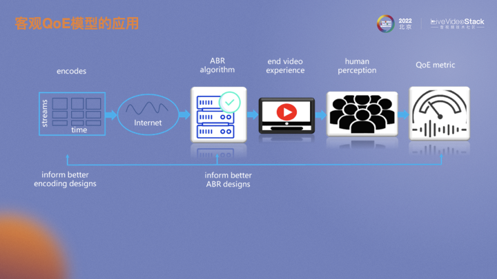 为什么要建立一套端到端的QoE评估体系呢?上图是视频从编码传输到被用户感知的流程。编码器将视频编成码流,经过复杂的网络环境会有各种码率自适应算法去感知当前网络变化或根据客户端播放情况自动做出合理的码率调整,以最大化用户在线观看视频的体验。一个端到端的QoE指标可以提供相对于PSNR、SSIM更贴合主观的画质指标。从而基于这个指标可以指导编码器选择最优编码参数,进而在不影响用户感知画质情况下实现码率节省。类似的,它也可作为ABR算法的参考指标。