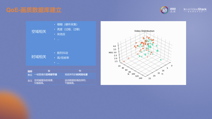 如何在视频失真类型以及视频特征上最大化多样性呢?首先考虑空域失真即画面失真,一般会因为视频采集时聚焦不准而导致模糊,会由于背光等光照不均匀时出现过暗或过曝。视频传输前会通过编码器编成码流,由于有量化操作所以在解码后会有块效应,还有其他很多类型的失真。时域相关的失真一般会有画面卡顿以及不同的视频帧率。从特征层面去表述或者区分的话,用经典的视频特征SI和TI表述。SI表示视频的空间细节程度,越复杂的场景SI越高;TI表示视频在时域上的画面变化程度,运动越剧烈的场景TI越高。