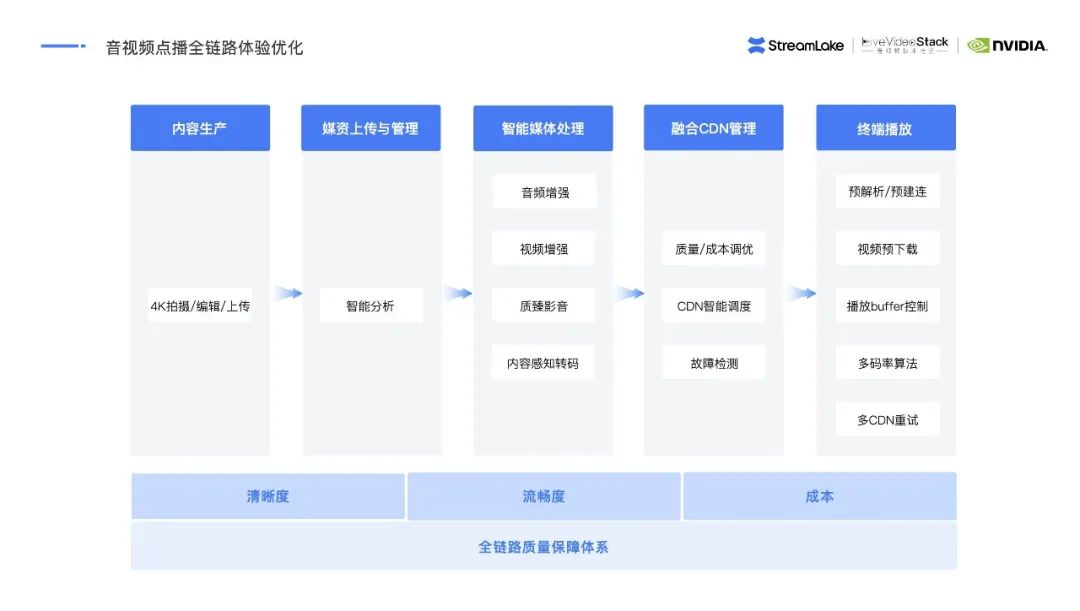 快手支持4K视频的拍摄、编辑和上传,保障视频上传时的原始质量。此外,媒资上传管理平台可实现视频的智能分析,而媒体智能处理平台可以进行视频增强、音频增强、质臻影音和内容感知转码等操作。融合CDN管理实现多CDN的调度。终端播放可从多个清晰度档位中调用多家CDN,结合端上所有优化,最终呈现给用户。整个链路实现了端到端的全链路优化,既保障清晰度和流畅度,又实现了成本的最优化。