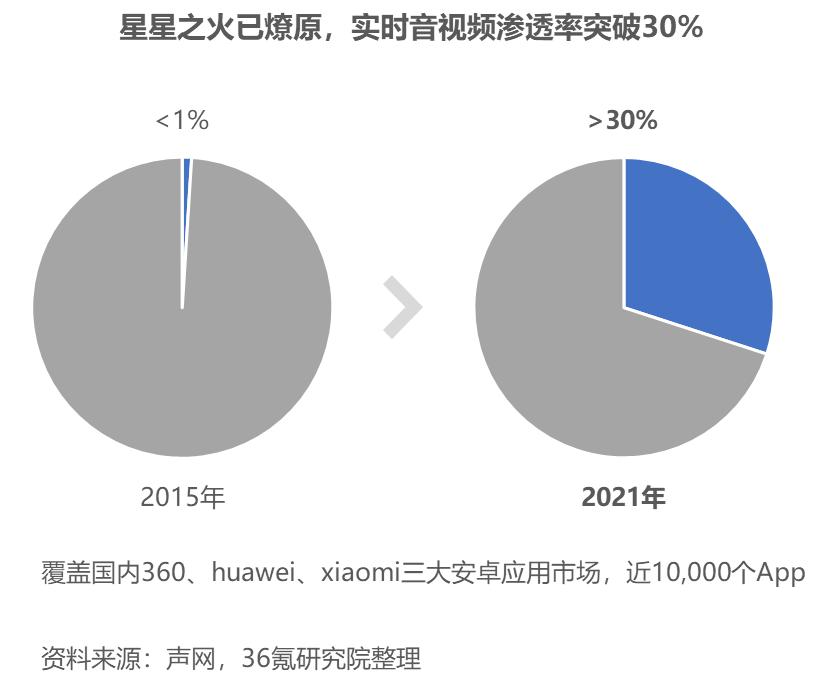 早在 2015 年左右,直播和短视频的兴起带动人们信息消费的内容逐渐从文字向语音、视频信息转变,加之全民 ” 宅家 ” 时期人们居家生活娱乐习惯的养成,促使视频会议、在线教育、电商直播等实时音视频的需求迅速爆发。实时音视频在国内 360、华为、小米三大安卓应用市场的近 10,000 个 App 中的渗透率,2015 年还不到 1%,2021 年已突破 30%。业界认为,在未来几年,实时音视频技术在关键行业的渗透率可能将超过 50%。实时音视频英文全称 Real-Time Communication,简称 RTC,作为一种终端服务,为行业提供高并发、低延时(数据传输延迟低于 400ms)、高清流畅、安全可靠的全场景、全互动、全实时的音视频服务,广泛地应用于泛娱乐、教育、医疗、金融等行业,在互动直播、在线授课、视频会议、游戏连麦等应用场景中发挥着重要作用,不断推动着人们沟通互动方式的改变,为传统应用场景带来体验的升级,也不断探索出更多新应用场景的落地。