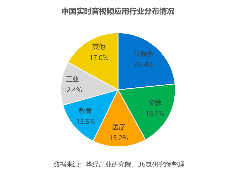 从应用行业分布情况看,根据华经产业研究院数据,泛娱乐、金融、医疗、教育、工业行业的占比依次为 23.4%、18.7%、15.2%、13.5%、12.4%,为 RTC 的热门应用行业。
