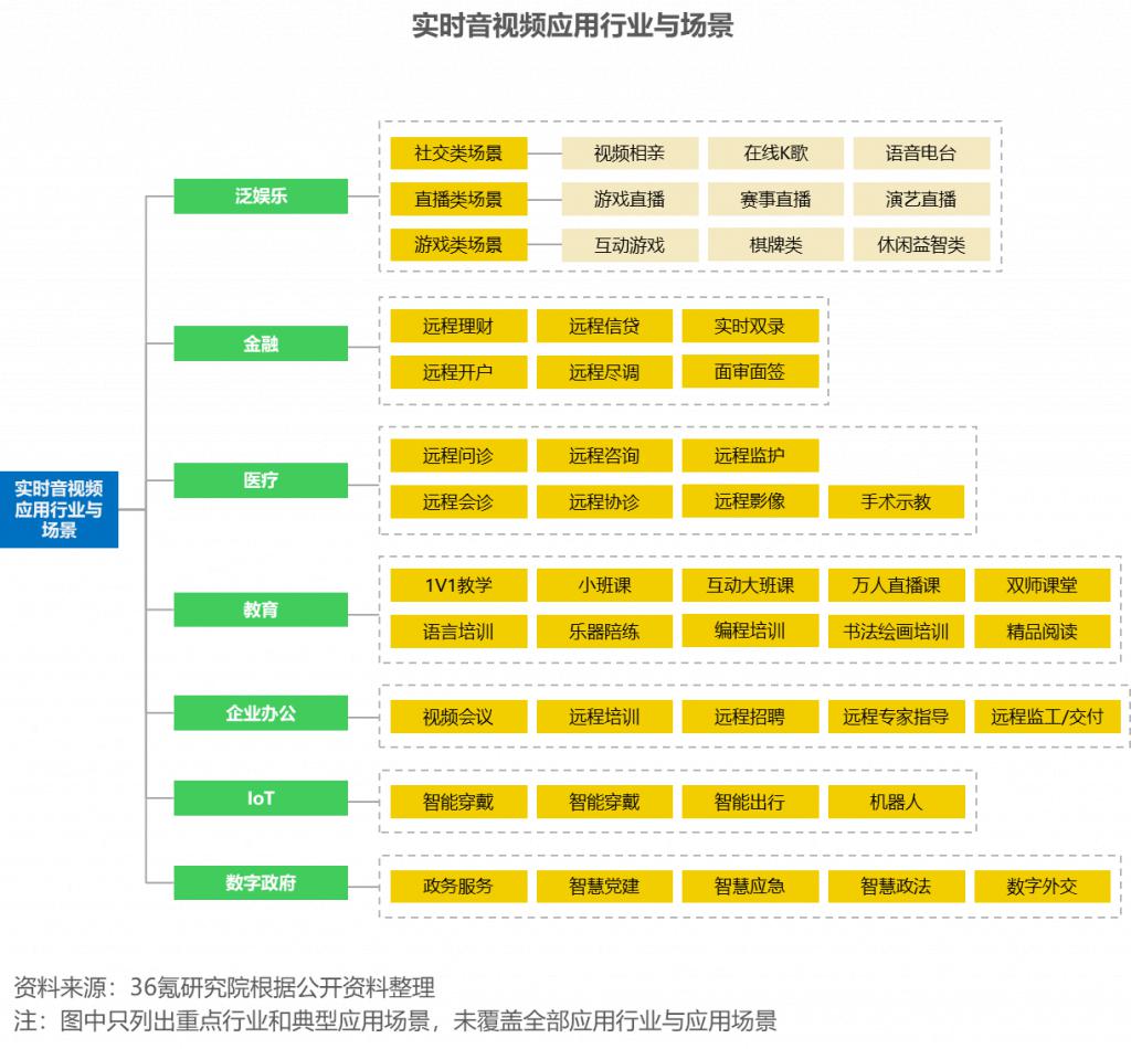 教育:RTC 是在线教育的基础设施,应用场景众多,主要包括 1V1 教学、小班课、互动大班课、万人直播课 / 公开课、双师课堂等教学场景。同时,RTC 技术也正在向素质教育个性化场景延展,如语言培训、乐器陪练、编程培训、精品阅读等。