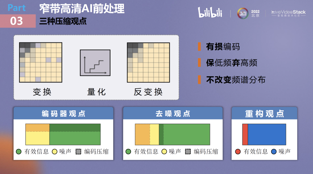 首先谈谈传统的编码观点,编码实际上是在DCT频域人为制造精度缺损以达到码率节省的目的。但可以看到,如果以高观点来看待这个问题,编码器是不关注编码单元中的内容的,它一视同仁地做有损编码,从高频到低频去相对应地去抹掉特定的频率分量。它对编码内容的频谱不做任何改变,并不知道自己压缩了什么,在压缩有效信息的同时也去压缩噪声,反之亦然。