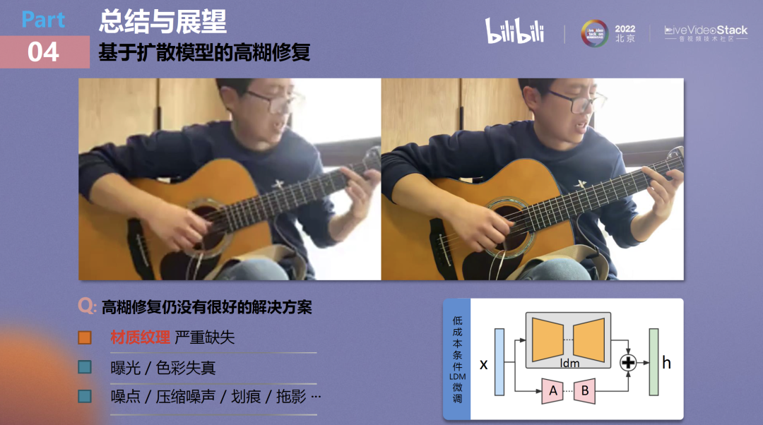 至此今天主要的分享内容结束,接下来想和大家介绍我们将持续跟进的一项工作:高糊修复。在这次LiveVideoStackCon上我们遇到了很多同行,经过交流,这也是同行们做视频云业务都会遇到的问题。高糊修复在一些特定场景有重要用途,如老片修复或一些拍摄质量极低的视频修复。